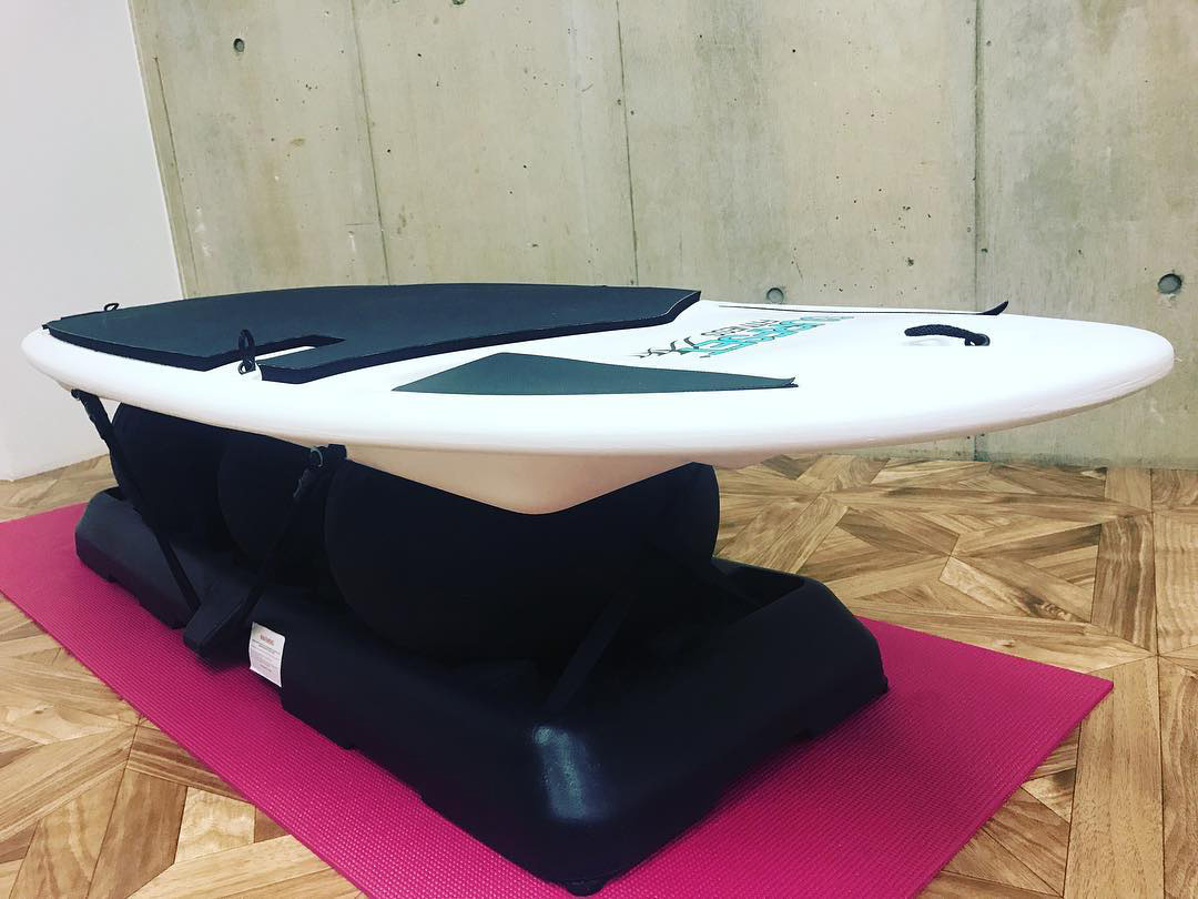 サーフヨガとは、サーフボードの下にバランスボールがついている専用機器を用いて行う